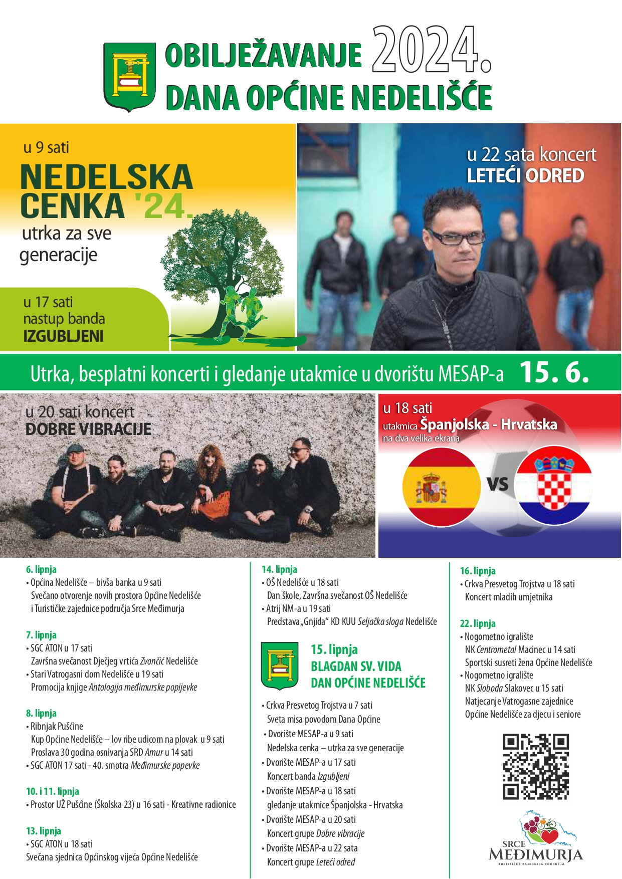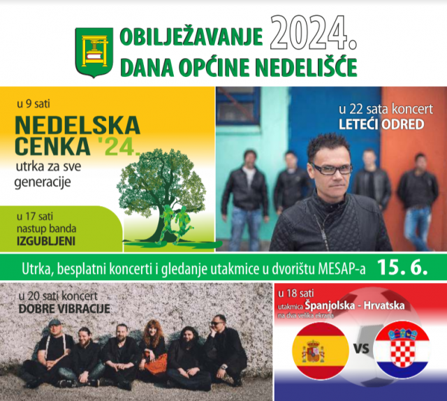 Vikend prepun događanja započnite već od 9 sati 15. lipnja utrkom za sve generacije Nedelska cenka na otvorenom prostoru MESAP – a, prošećite do Lovačkog doma Fazan i uključite se u radionice za djecu i odrasle, pogledajte izložbu mnogobrojnih umjetnika na otvorenom i uživajte u Zen zoni Art forest festivala. Već od 17 sati na ljetnoj pozornici u dvorištu MESAP – a zabavljat će vas rock band Izgubljeni kao uvertira za praćenje nogometne utakmice Španjolska – Hrvatska na čak dva velika ekrana. Nakon utakmice nastavite u dobrom raspoloženju uz koncert Dobrih vibracija, a od 22 sata očekuje vas koncert grupe Leteći odred.
