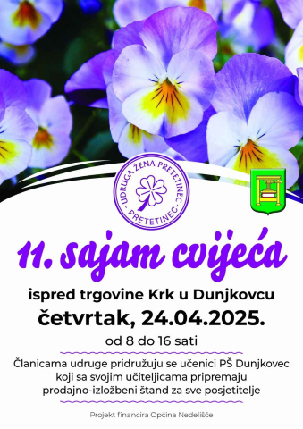 tradicionalni Sajam cvijeća sa raznolikom ponudom sadnica, proljetnica koje će krasiti mnoga dvorišta i javne površine. Kao i svake godine pridružit se učenici PŠ Dunjkovec sa svojim rukotvorinama, dati sajmu dašak ljubavi prema cvijeću, a upotpuniti ga svojim kreacijama.