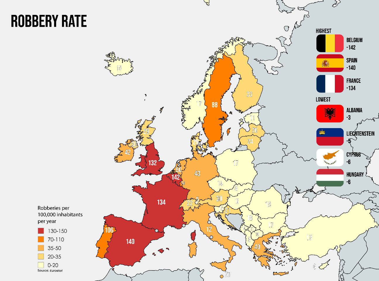 Belgija, Španjolska, Francuska i UK europske su države s najvećim broje prijavljenih razbojstava u Europi. Na karti koja smo izradili na temelju istraživanja jasno se vidi razlika između država zapadne i istočne Europe. Uglavnom sve europske države nalaze se na začelo ove liste, a razlika u broju prijavljenih razbojstava u odnosu na zapadne države je više nego očita. Najmanji broj razbojstava na 100.000 stanovnika prijavljen je u Albaniji, Lihtenštajnu, Cipru i Mađarskoj.
