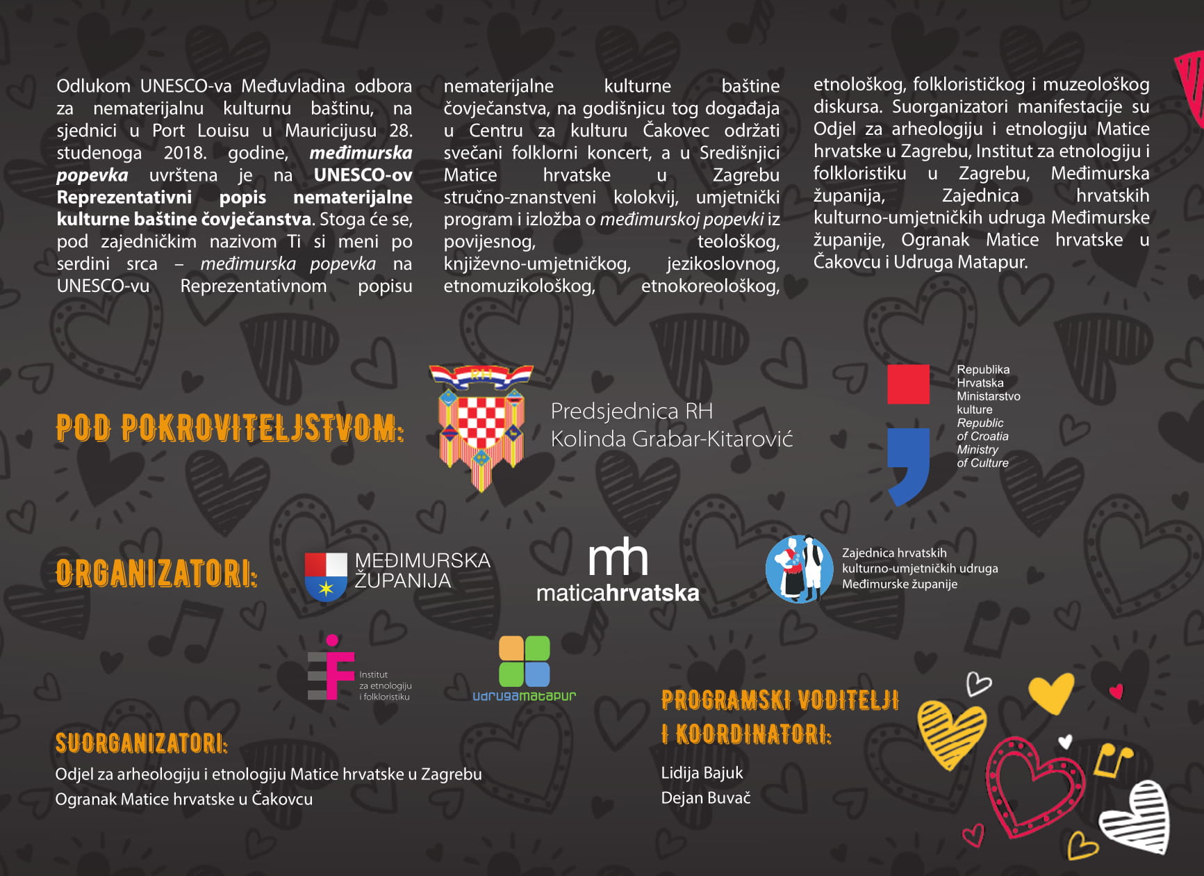 Predsjednik Zajednice hrvatskih kulturno-umjetničkih udruga Međimurske županije Dejan Buvač najavio je bogat program „Ti si meni po serdini srca“ koji će se u organizaciji Međimurske županije, Matice hrvatske, Zajednice kulturno-umjetničkih udruga Međimurske županije, Instituta za etnologiju i folkloristiku i Udruge Matapur, pod pokroviteljstvom predsjednice Republike Hrvatske Kolinde Grabar-Kitarović i Ministarstva kulture, održati 26. i 28. studenog ove godine u Čakovcu i Zagrebu. „U Čakovcu ćemo prezentirati popevku u izvornom obliku i to nastupom većine članova Zajednice hrvatskih kulturno-umjetničkih udruga Međimurske županije, a drugi dio programa je stručno-znanstveni kolokvij s umjetničkim programom u Zagrebu – znanstveni dio će obuhvatiti fenomen međimurske popevke, dok će umjetnički program biti malo drugačiji; kroz sve vidove glazbe, a ne samo kroz tradicijski.“