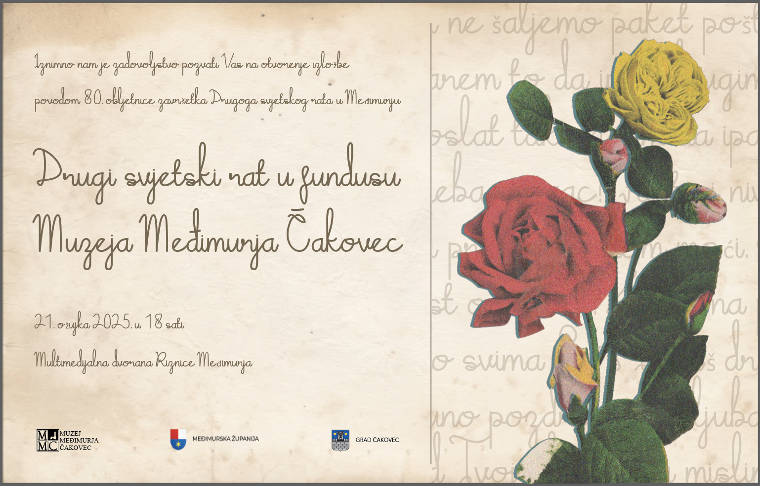 Izložba nema ambiciju i ne može spomenuti sve sudbine, žrtve, sudionike NOB-a i događaje iz Drugoga svjetskog rata – takve se informacije mogu pronaći u već objavljenim knjigama. Izložba želi građom koja se čuva u muzejskom fundusu, kroz sudbine pojedinih obitelji, priče o spomenicima i slično približiti posjetiteljima, posebno mlađim generacijama, Drugi svjetski rat u Međimurju. Posebnost ove izložbe je naglasak na pričama 𝑖𝑧 𝑝𝑟𝑣𝑒 𝑟𝑢𝑘𝑒 a izložit ćemo i fotografije koji su skupljene proteklih godina. Ovom prilikom zahvaljujemo članovima obitelji dionika Drugog svjetskog rata koji su Muzeju Međimurja Čakovec ustupili vrijednu dokumentaciju, osobne predmete i svjedočanstva.