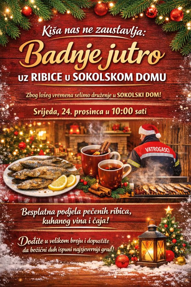 Zbog najave lošeg vremena i kiše, druženje uz ribice ove se godine s Gradske tržnice seli u Sokolski dom, kako se lijepa tradicija ne bi prekinula i kako bi svi mogli uživati u ugodnom i toplom blagdanskom ambijentu.