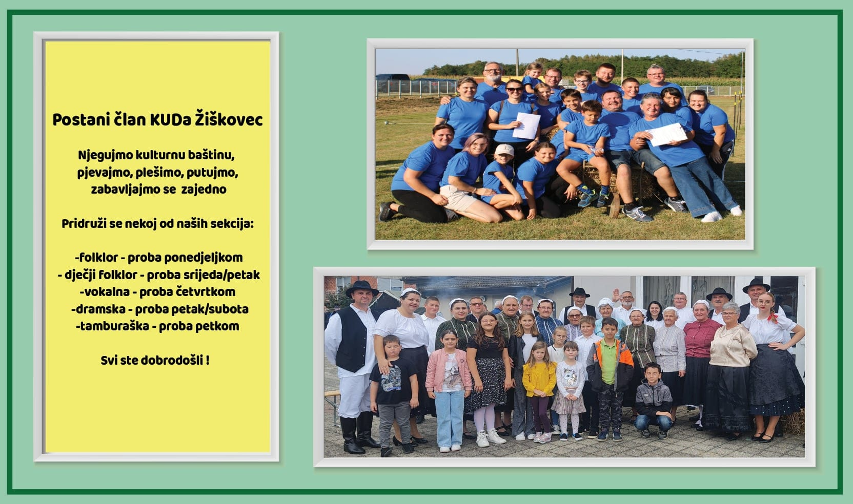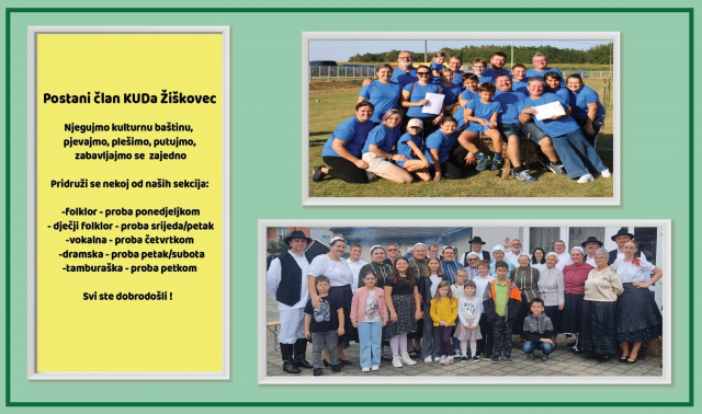 KUD Žiškovec pozdravlja buduće članove: Postani član KUD -a Žiškovec, njegujmo kulturnu baštinu, pjevajmo, plešimo, putujmo, zabavljajmo se zajedno. Pozivaju se novi članovi da se pridruže nekoj od njihovih sekcija – folkloru, dječjem folkloru, vokalnoj skupini, dramskoj, ili pak tamburaškoj.