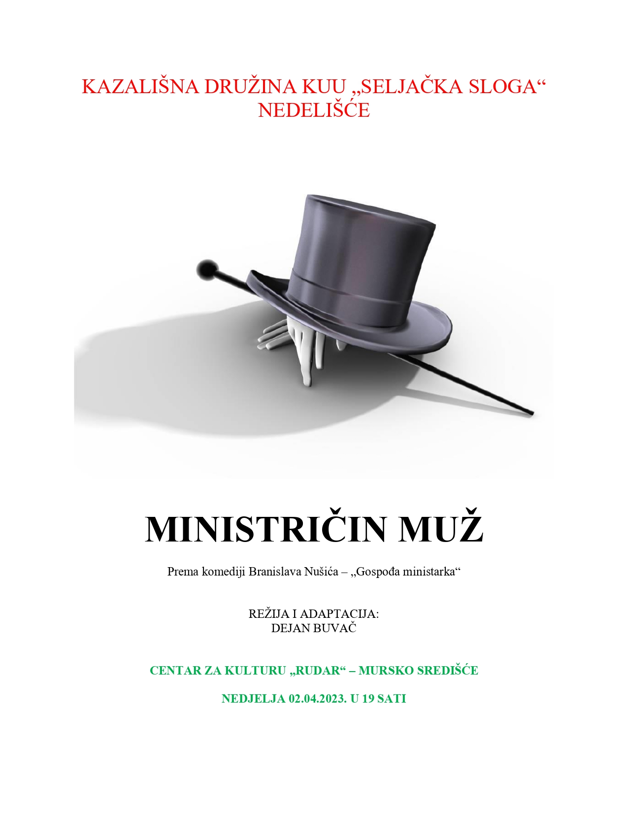 U nedjelju, 2. travnja s početkom u 19.00 sati u Centru za kulturu „Rudar“ na rasporedu je kazališna predstava „Ministričin muž“ Seljačke sloge iz Nedelišća. Cijena ulaznice je 4,00 eura, a mogu se kupiti putem interneta ( https://czk-rudar.hr/#seats?st=38&po=2023-04-02&kr=378 ) ili na blagajni Centra za kulturu „Rudar“ sat vremena prije bilo kojeg događanja koje je na rasporedu.