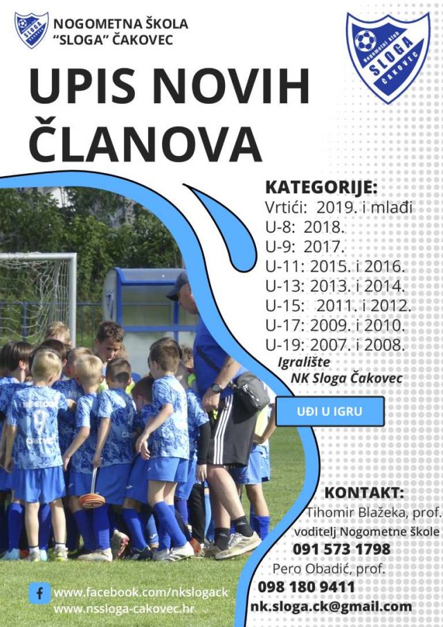 Nogometna škola NK Sloga Čakovec s ponosom objavljuje početak nove sezone i poziva sve zainteresirane djevojčice i dječake da se pridruže nogometnoj obitelji!
