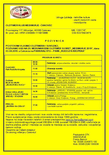 Najveći, i najbrojniji hrvatski Oldtimer kub godinama je Oldtimer klub Međimurje, a on u subotu 03.kolovoza 2019. organizira 20. međunarodni oldtimer susret ‘Međimurje 2019’ koji će obilovati mnogim atraktivnim događanjima.