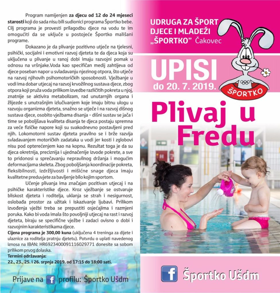 Udruga za šport djece i mladeži iz Čakovca poziva roditelje na program PLIVAJ U FREDU. Riječ je o programu koji je namijenjen mališanima od 12 do 24 mjeseci starosti koji nisu bili sudionici Športko bebe programa.