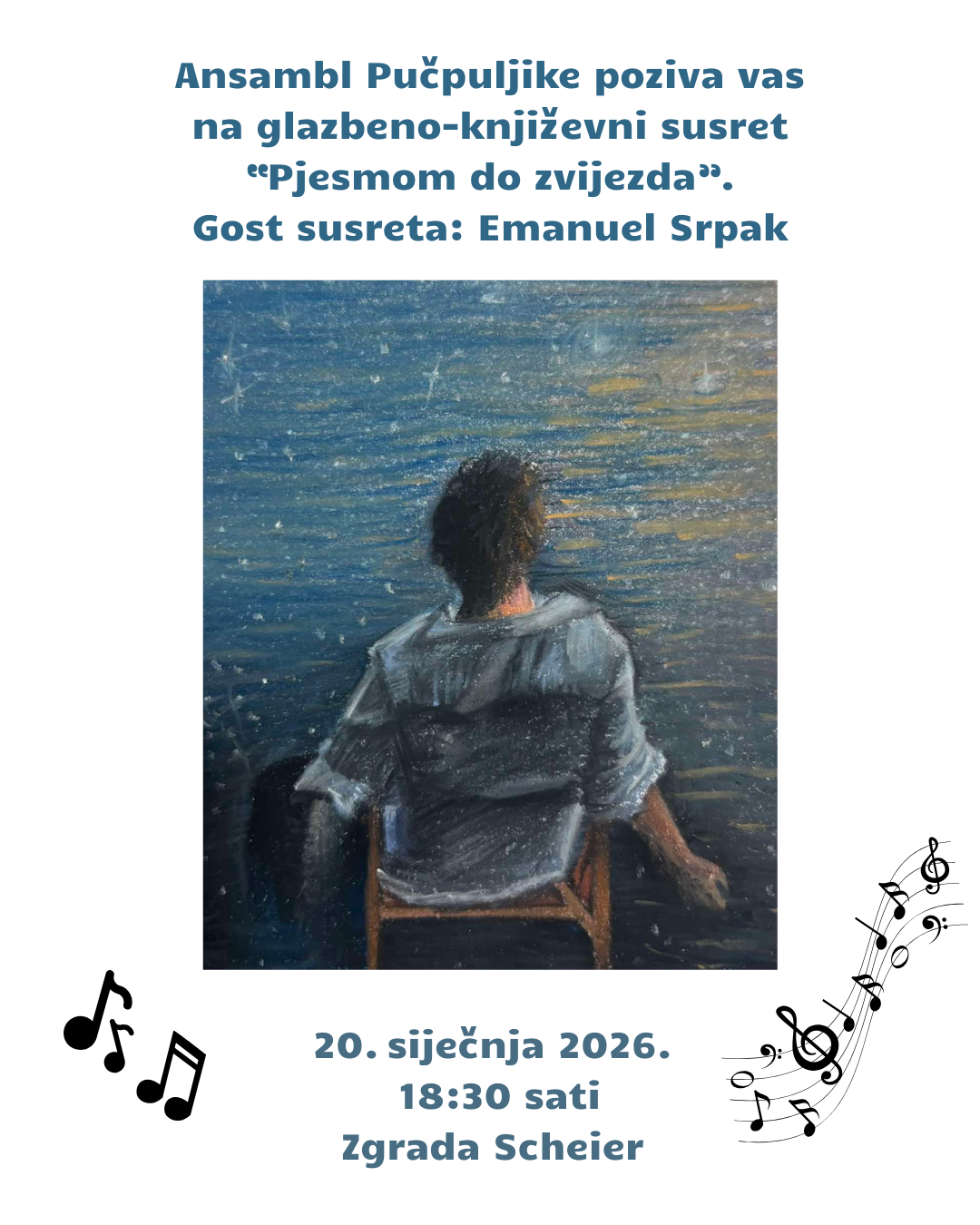 Dragi ljubitelji glazbe i poezije, čast nam je pozvati vas na 1. glazbeno-književni susret Ansambla Pučpuljike “Pjesmom do zvijezda”. Dođite i provedite večer ispunjenu ljepotom pjesme i dobrih emocija! “Radujemo se vašem dolasku!” poručuju Pučpuljike.