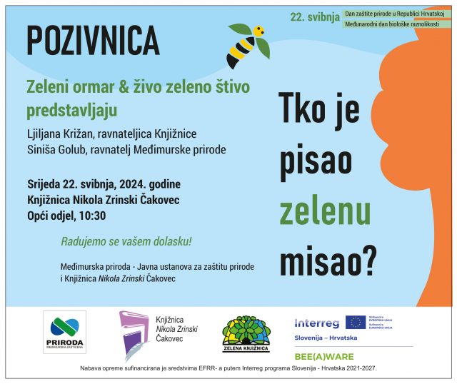 Tko je pisao zelenu misao? Javna ustanova Međimurska priroda i Knjižnica Nikola Zrinski Čakovec pozivaju vas doći na svečanost i otkriti sadržaj polica Zelenog ormara. Događaj je dio programa obilježavanja Tjedna zaštite prirode (20. – 25. svibnja) u organizaciji Međimurske prirode. Dobro došli!