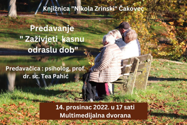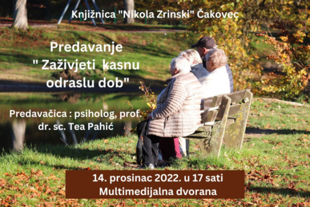 U multimedijskoj dvorani čakovečke Knjižnice Nikola Zrinski, u 17 sati počinje predavanje “Zaživjeti kasnu odraslu dob”. Predavanje organizira Knjižnica u suradnji s Udrugom umirovljenika Grada Čakovca, a održat će ga psihologica Tea Pahić. Na predavanju će se predstaviti kratki video o tome kako mlađe generacije danas poimaju starost, razgovarat će se o stereotipnim mitovima o starijim osobama i kako oni utječu na njih te će razgovarati uz čitanje kratke priče „Gospođo, vi ste bogati!”. Za kraj predavanja, predviđeno je nekoliko zabavnih primjera i dosjetki o dobrobitima starenja.