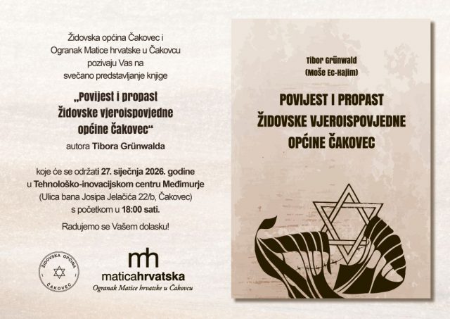 Povodom Međunarodnog dana sjećanja na žrtve Holokausta, Židovska općina Čakovec i Ogranak Matice hrvatske u Čakovcu u utorak, 27. siječnja 2026. godine, upriličit će svečanost predstavljanja knjige „Povijest i propast Židovske vjeroispovjedne općine Čakovec“ autora Tibora Grünwalda.