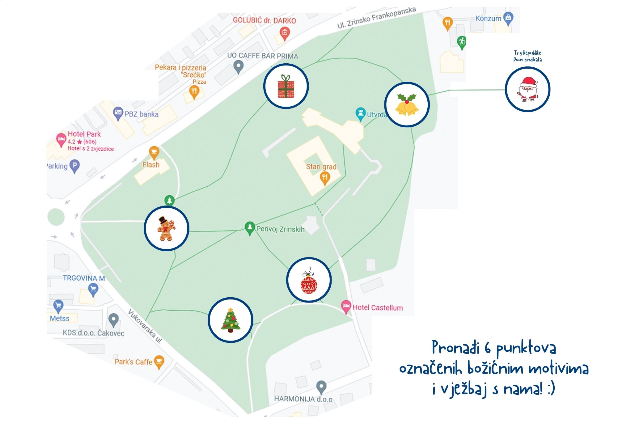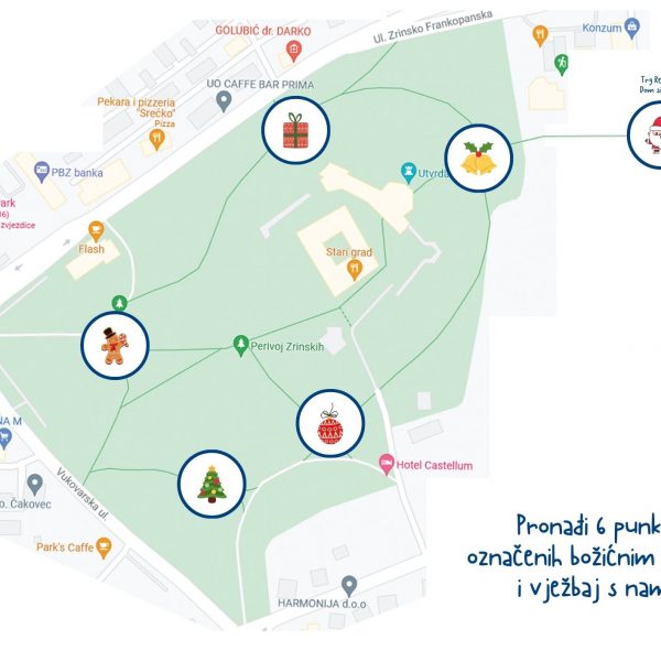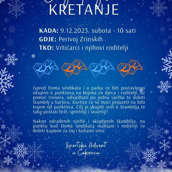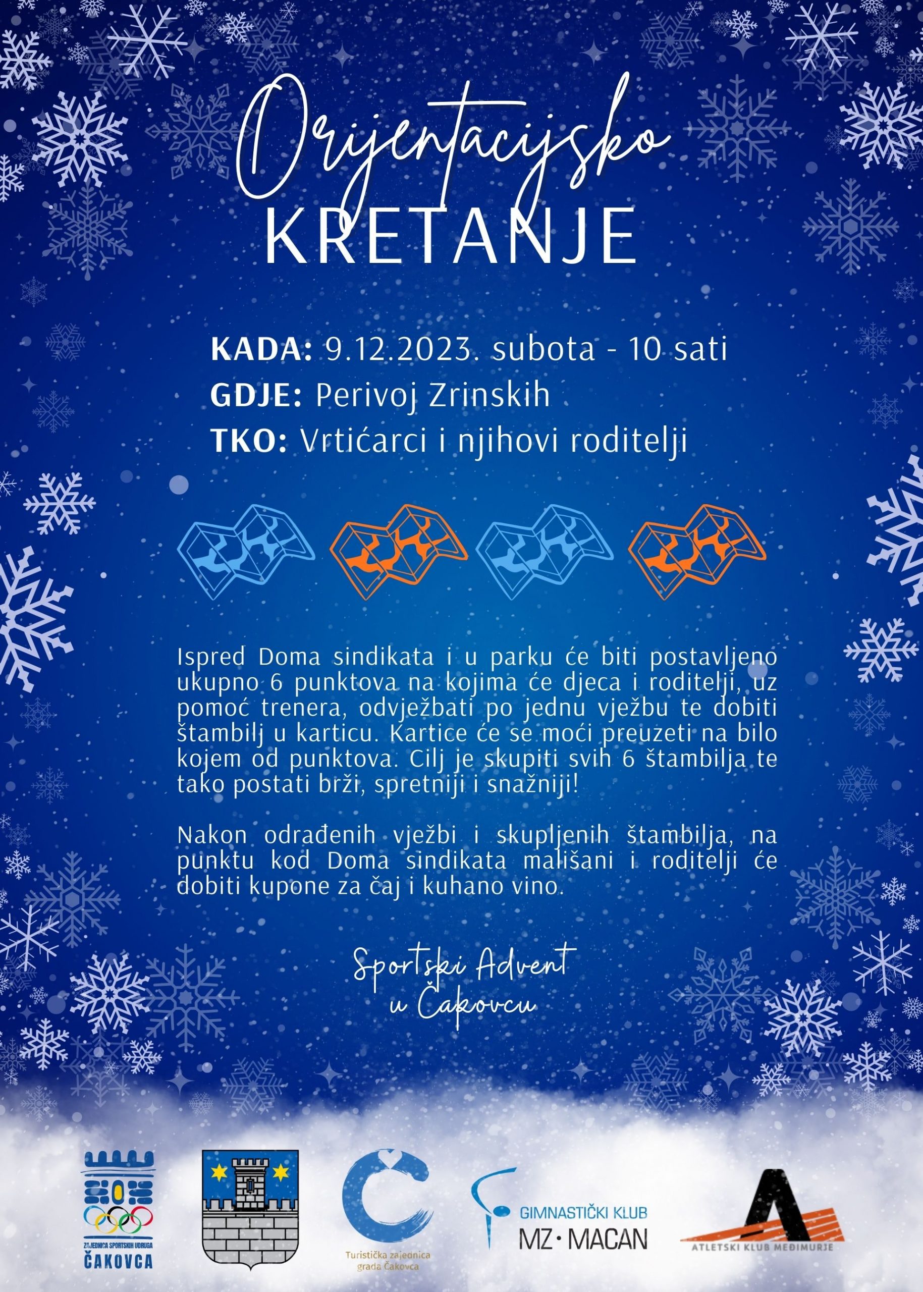 U subotu 9. prosinca 2023. s početkom u 10h na Trgu Republike i Perivoju Zrinski okušajte se u ORIJENTACIJSKOM KRETANJU SA ZADACIMA. Na šest punktova u Perivoju Zrinski i u gradskom središtu od 10 do 11 sati čekat će vas treneri GK Marijan Zadravec Macan. Na početnom punktu ispred Doma Sindikata moći ćete podići blok za pečatiranje i kartu na kojoj će biti ucrtani svi punktovi. Na svakom punktu mališanima i njihovim roditeljima treneri će staviti pečat na blok. Nakon što dobe pečat treneri će im dati jednostavni zadatak (napraviti 10 čučnjeva, skakanje po jednoj nozi ili slično) kojeg moraju ispuniti do sljedećeg punkta. Karticu sa svih šest pečata sudionici Orijentacijskog kretanja na punktu kod knjižnice mijenjaju za bon na temelju kojeg mališani imaju pravo na čaj, a njihovi roditelji i staratelji na kuhano vino.