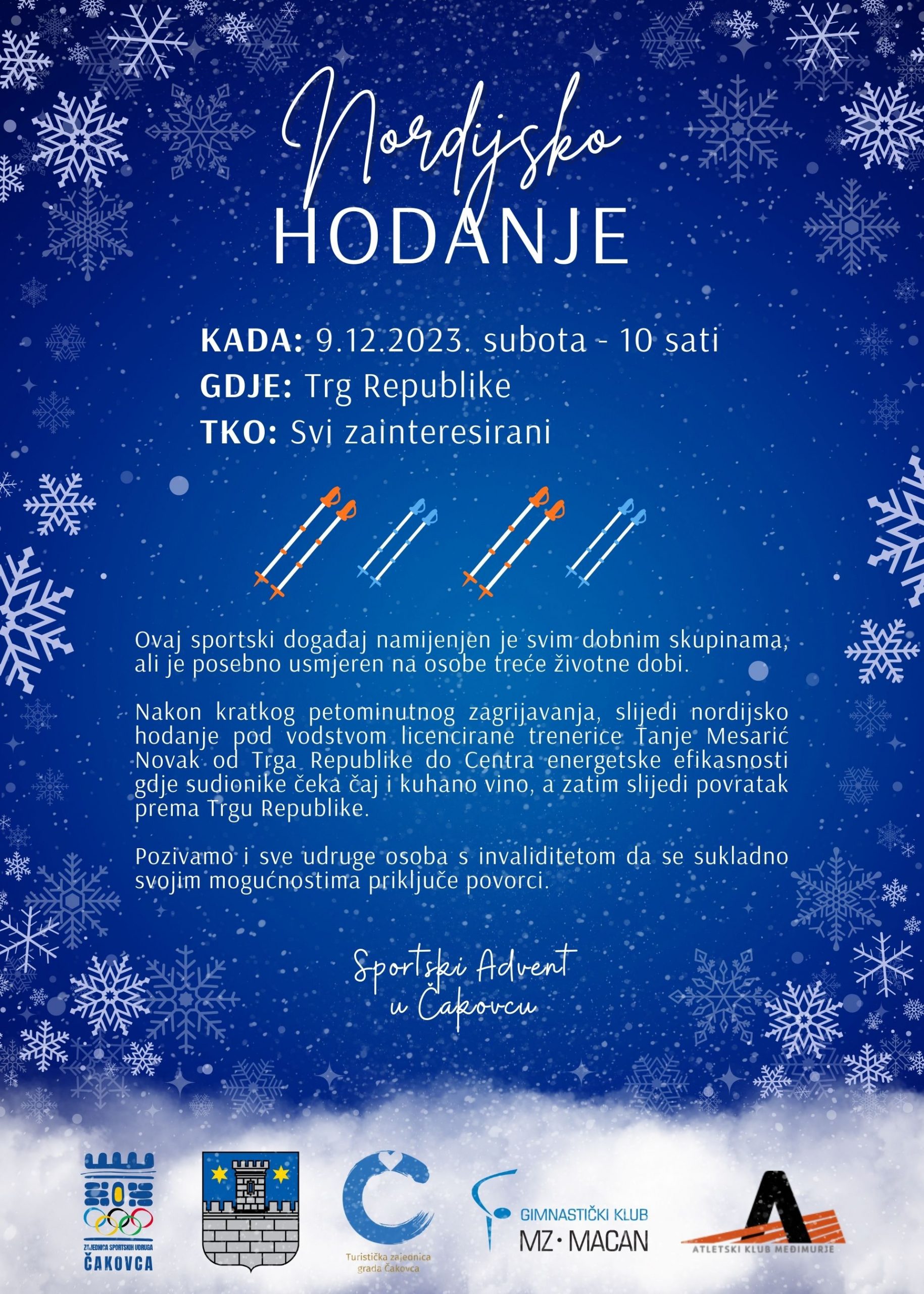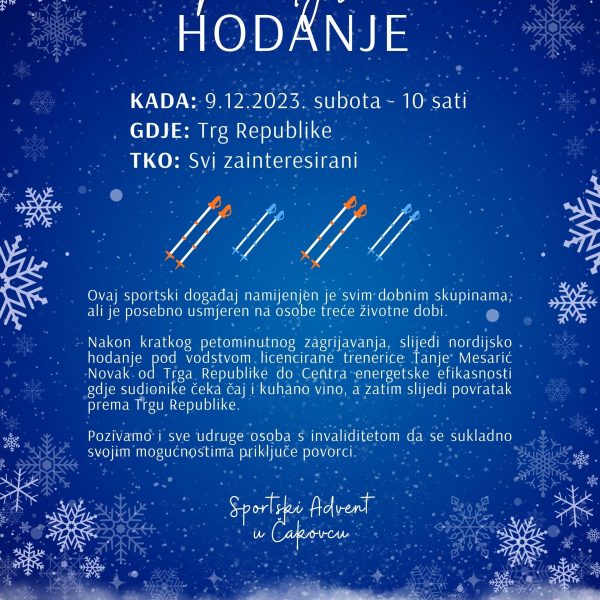 Oni stariji i željni dužih šetnji mogu također ove subote 9. prosinca 2023. s početkom u 10h okušati se uNORDIJSKOM HODANJU. Nakon početnog zagrijavanja na čakovečkom Trgu Republike, licencirana trenerica nordijskog hodanja Tanja Mesarić Novak će sve sudionike hodanja sa štapovima provesti kružnom stazom kroz Perivoj Zrinski, pokraj SRC Mladost do kratke pauze uz okrijepu u Centru energetske efikasnosti. Nakon okrijepe sudionici šetnje se vraćaju na Trg Republike.