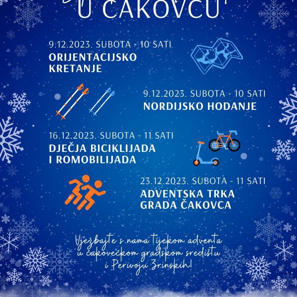 provedite sportsko-rekreativno subotnje prijepodne sa svojim najmilijima u sklopu Sportskog Adventa u Čakovcu. Zajednica sportskih udruga Čakovca u suradnji s Gimnastičkim klubom Marijan Zadravec Macan i Atletskim klubom Međimurje uz podršku Turističke zajednice Grada Čakovca pripremila je za vas tijekom ovogodišnjeg Adventa zanimljiv sportsko-rekreativni program.