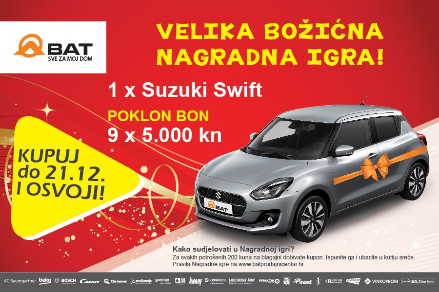 Kupujte u prodajnim centrima BAT u Murskom Središću i Čakovcu do 21. prosinca i osvojite sjajne nagrade! Čak 9 poklon bonova od 5.000 kuna, ali i prekrasan Suzuki Swift, čekaju na Vas!