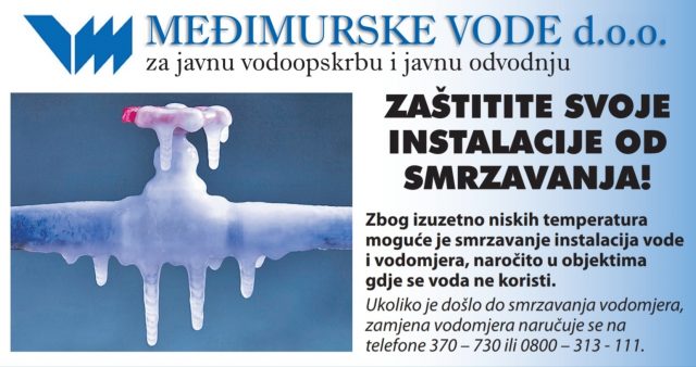 Poradi najavljenih izuzetno niskih temperatura, Međimurske vode d.o.o. uputile su apel korisnicima javne vodoopskrbe da poduzmu mjere zaštite svojih vodovodnih instalacija s posebnim naglaskom na opasnost od smrzavanja u objektima koji se ne koriste svakodnevno, poput vikendica ili kuća u izgradnji, gdje voda miruje u cijevima. Nužno je adekvatno izolirati vodomjerna okna i izložene dijelove sustava koji se nalaze izvan grijanih prostora kako bi se izbjegle znatne materijalne štete i prekidi u opskrbi.
